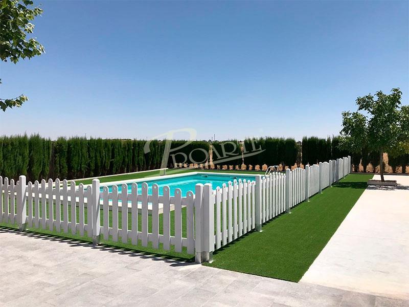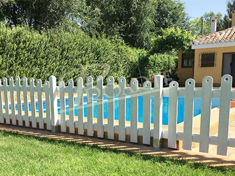 Valla fabricada en madera para exteriores tratada riesgo IV. Estructura formada por tabla cepillada acabado superior redondeado, postes verticales y conexión reforzada con tornillería de acero cincado. Acabado superior en semiluna.