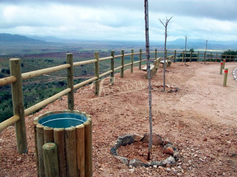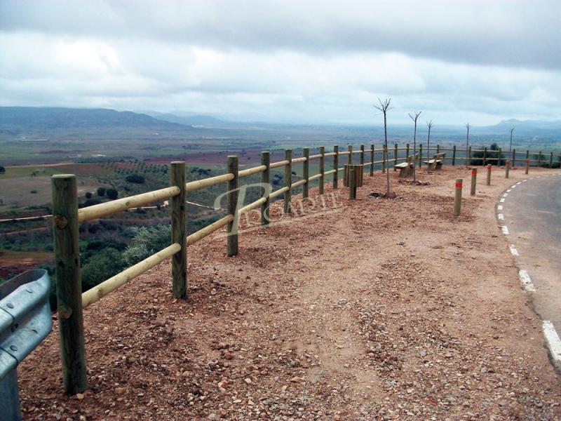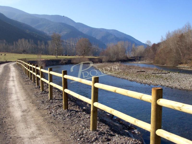 Valla fabricada en madera para exteriores tratada riesgo IV. Estructura formada por rollizos torneados, postes verticales y dos horizontales. Montantes embutidos en los verticales y conexión reforzada con tornillería de acero cincado.